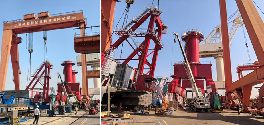 3月(yuè)28日(rì),初春時(shí)節,乍暖還(hái)寒。€<∏∑在江蘇格雷特重工(gōng)科(kē)技(jì)碼頭,兩∞©♣¥台150T門(mén)座起重機(jī)&l"™←dquo;三大(dà)件(jiàn)&rdqu>×o;正在吊裝上(shàng)船(chuán),準備發αΩ"γ往業(yè)主所在地(dì)—通(tōng™$)州灣某作(zuò)業(yè)區(qū)。